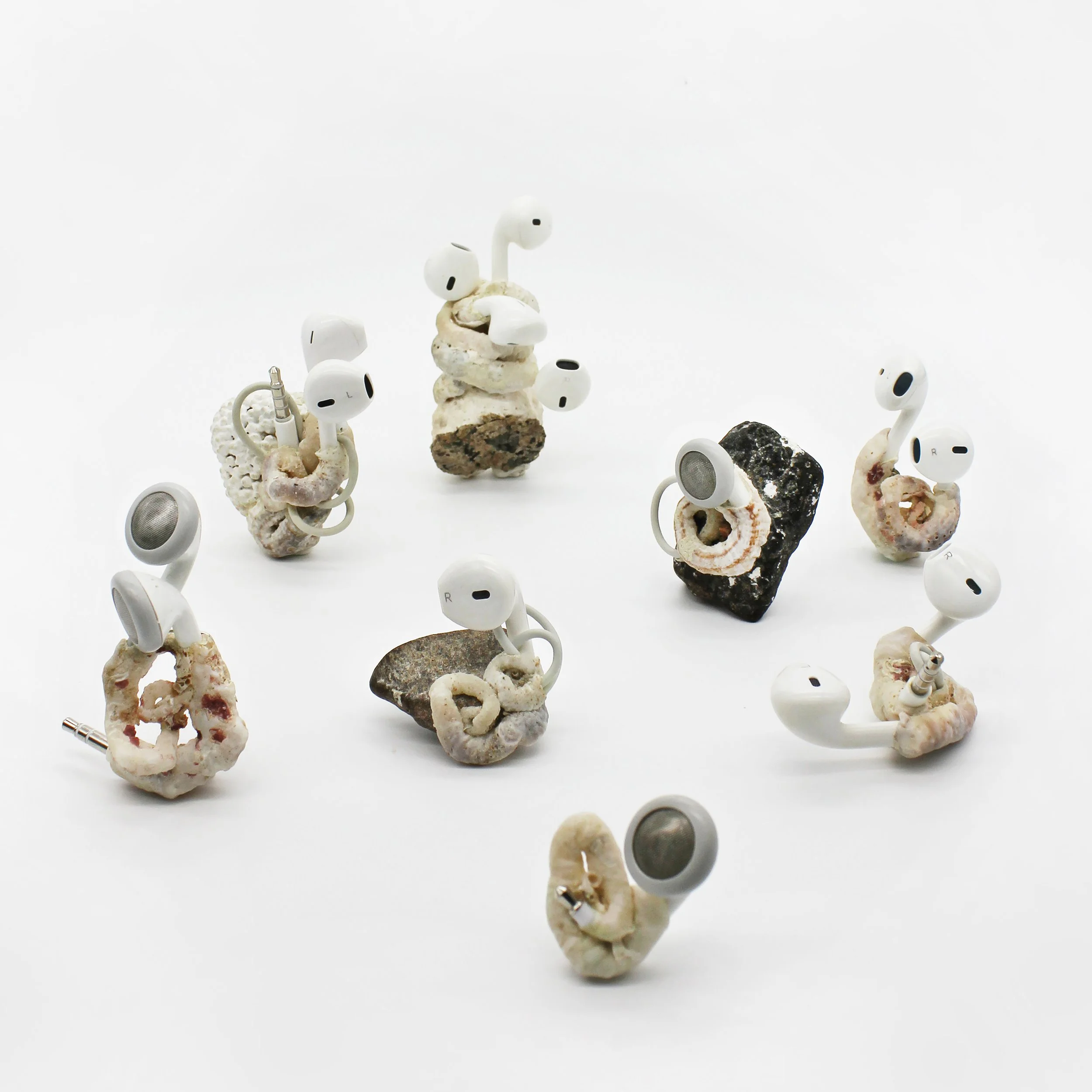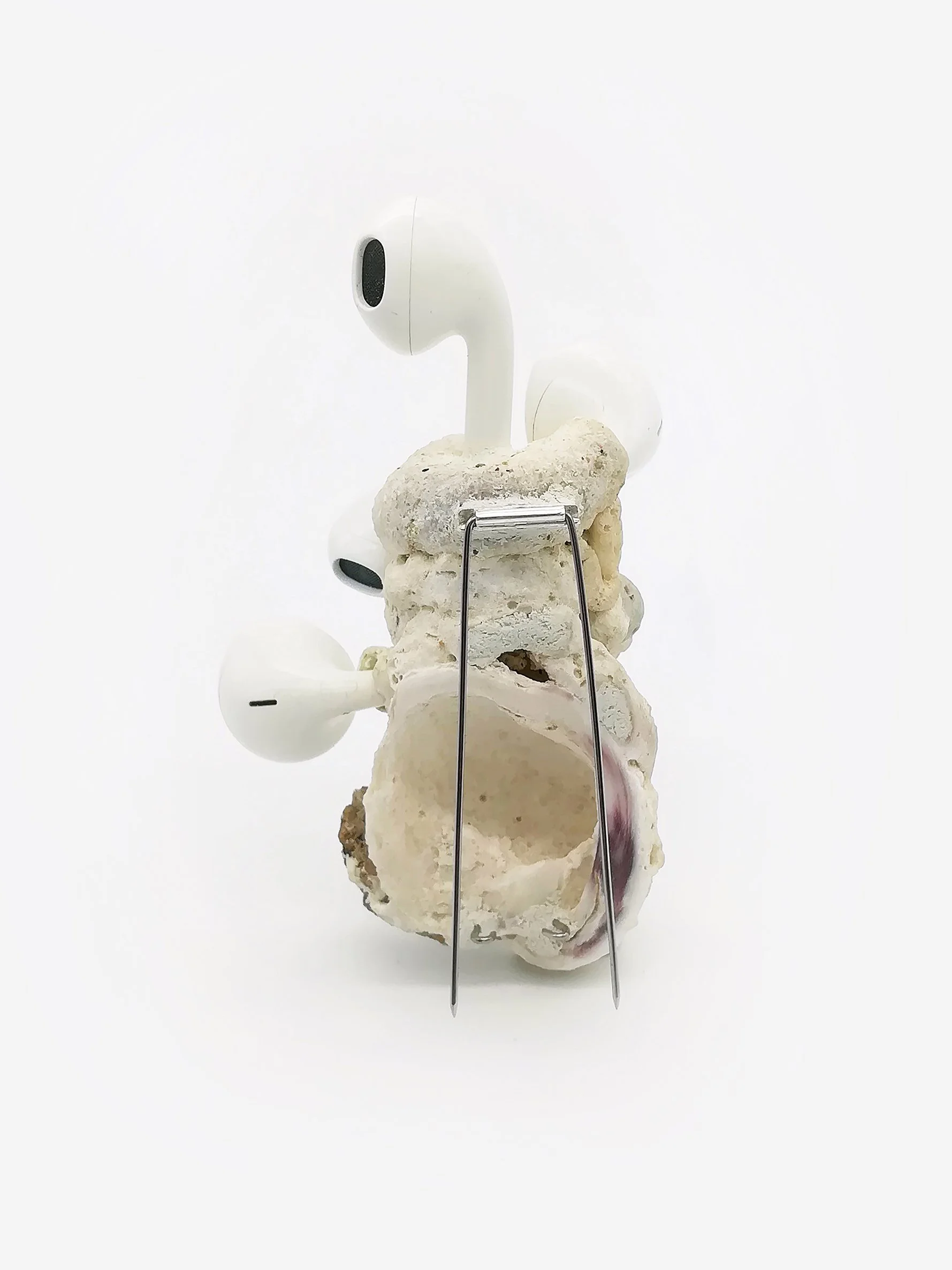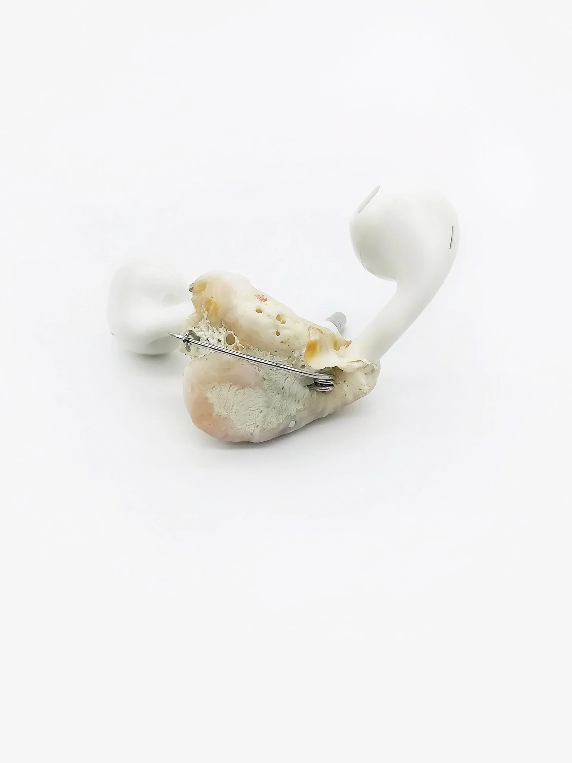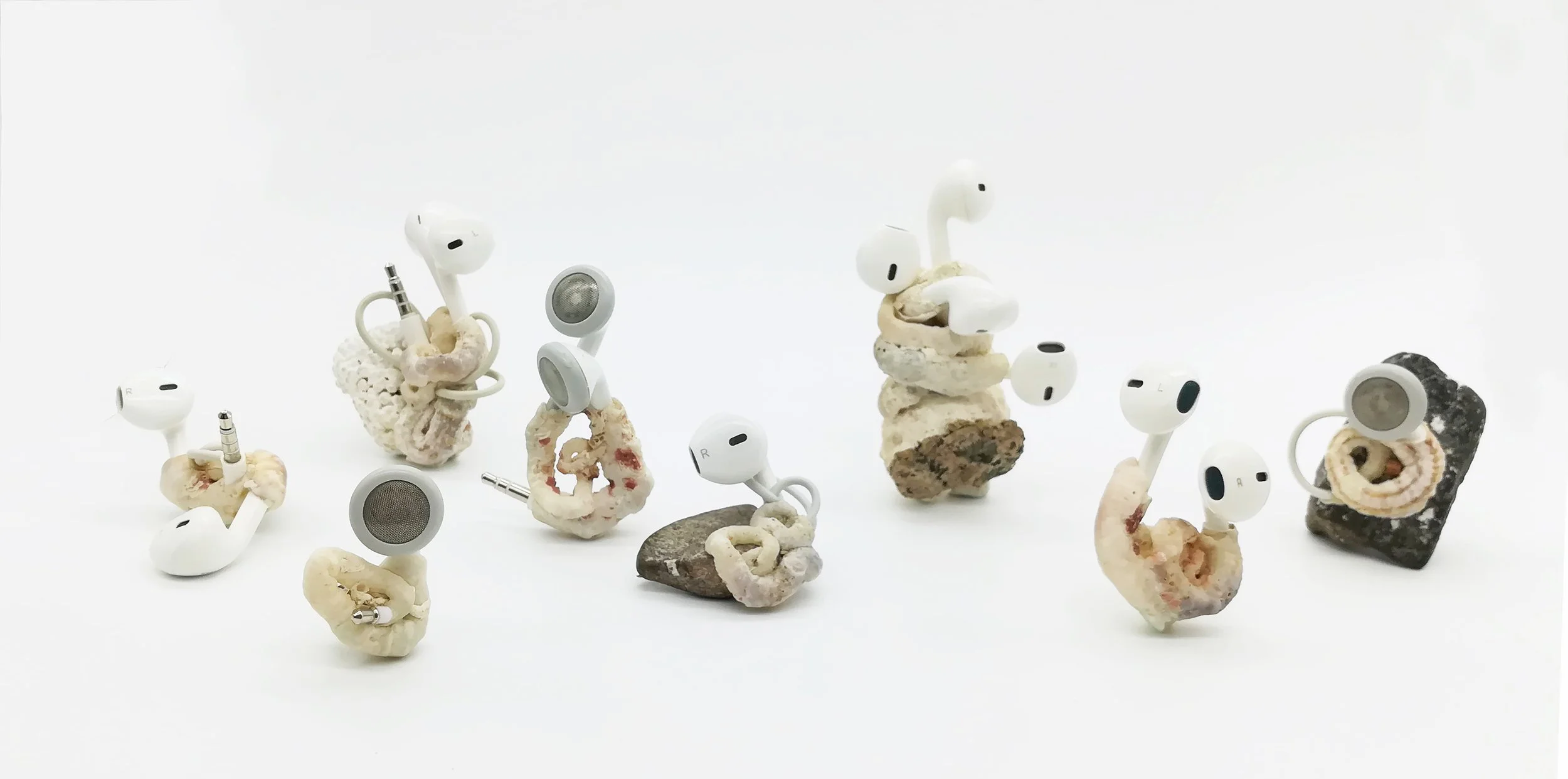 Polymorphic Appleoidæns exist in the Anthropocene- where latent objects of desire settle into a landscape of material culture undergoing reclamation into nature. The line between industry and nature dissolves as mutations give way to fragile new life forms. Such creatures emerge- forging life from vibrant matter, turning toxicity into sustenance and thereby demonstrating nature’s incredible ability to prevail. The artworks are situated intimately on the body, near in proximity to the domains they occupied in their times as consumer goods, thereby referencing the vibrant exchange resulting from countless hours spent intertwined with such technologies.